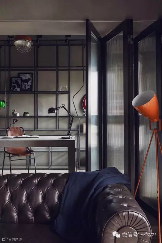 藏在玻璃推拉门之后的,就是书房啦,带有磨旧感的黑色铁艺皮件座椅,散发出挡也挡不住的工业风气息,本来放在客厅沙发旁的落地灯被搬到了这里,明亮的光线,适合于深夜阅读的时候使用。