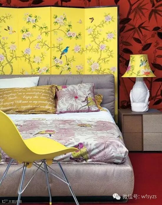 给床和红色的背景墙之间增添一扇淡黄色花鸟图案屏风,把卧室的美好尽情展现,呈现出一派四季如春的中国风格。