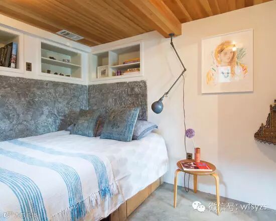 沿着床的墙面开辟出开放式的小柜子用作收纳,创意方式为卧室打造生活个性,床底空间也可以利用起来,收纳型的床铺则为卧室添置了收纳空间。