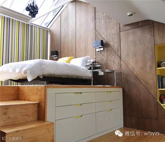 小卧室空间可以开辟墙面和高度空间,这款卧室抬高的床面给人一种小复式的错落感,墙面除了做成柜层之外,都是可以拉出来的橱柜,床下也是写收纳柜。