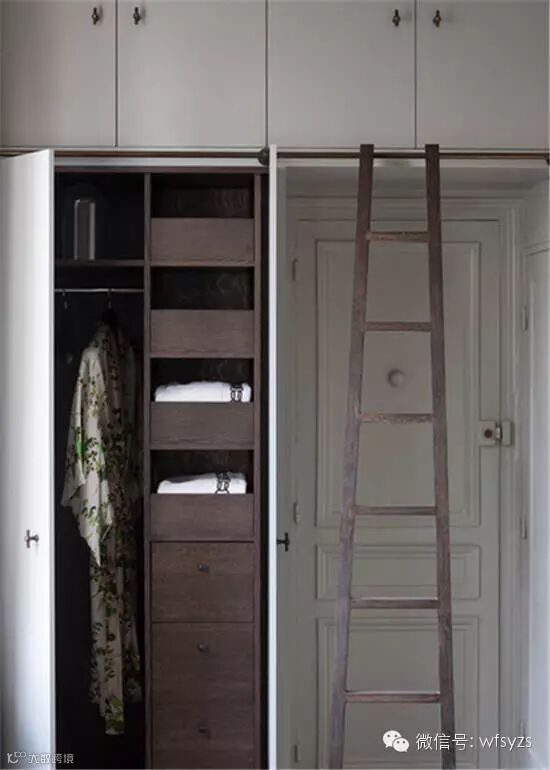 一个灵活移动的小梯子让顶部的橱柜用起来很是方便,抽屉橱柜交错的多样式收纳很是实用。