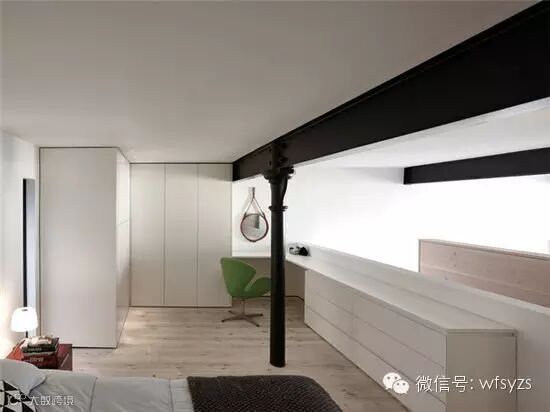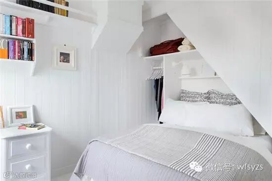 这间阁楼卧室,用纯新白色塑造房屋的明亮感,巧妙运用床头墙面,将收纳衣橱和床头灯集中于此。