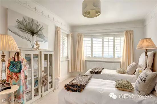 米色的窗帘让乳白卧室很有温馨感,玻璃橱柜的收纳让人感觉琳琅满目,搭配黑白挂画,让居住空间的美感也有艺术气息。