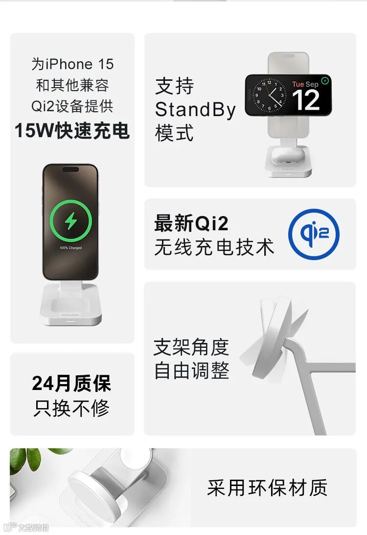 mophie 三合一充电支架不仅功能强大,还能适应多种使用场景: