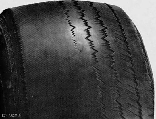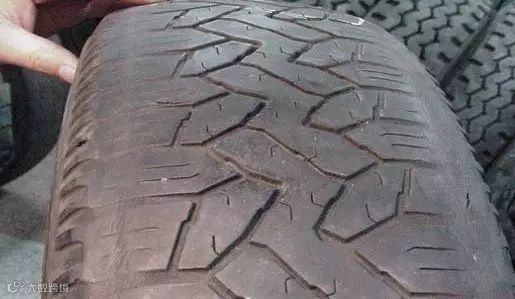 发现轮胎着地部分的中心面积出现严重磨损的情况,这表明轮胎经常处于充气过满的状态。这种轮胎很容易爆胎,多加小心。