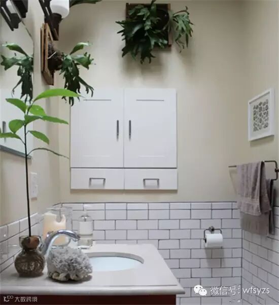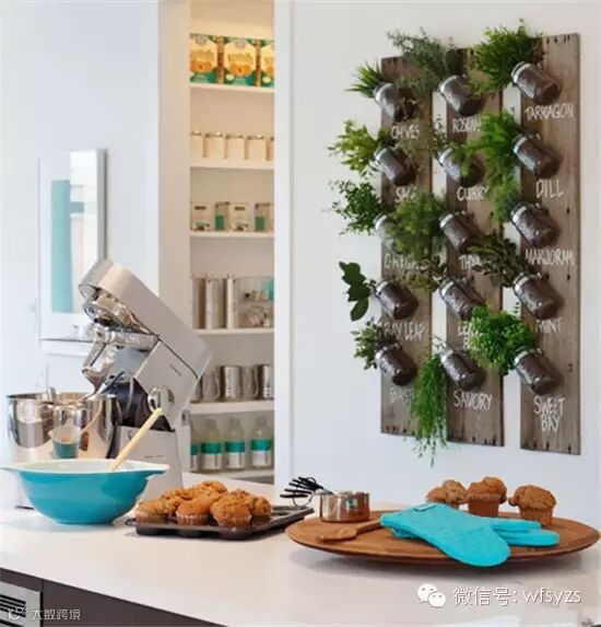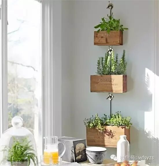 餐区墙壁的小墙体都是小植物栖身之所,像案例中这样的绿植设计,既美观又实用,每一个木质收纳篮都由一个S钩与墙面上的挂钩连接,制作简单,等比例缩放的花盆设计让墙面多了一份灵活的美感。