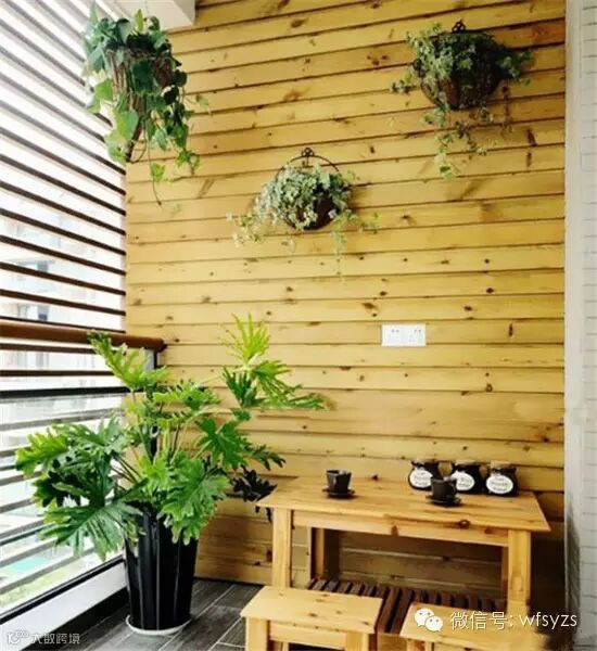 国内多见封闭式阳台,如果阳台开阔不妨也做个简易小花园,让绿色来改变居室格调跟家居心情。墙体做了木板铺设,清雅的木质色调搭配绿色的植物自然是极好的。除了常规可见的地置的绿色盆栽外,配合挂起来的小植物们令人眼前一亮。