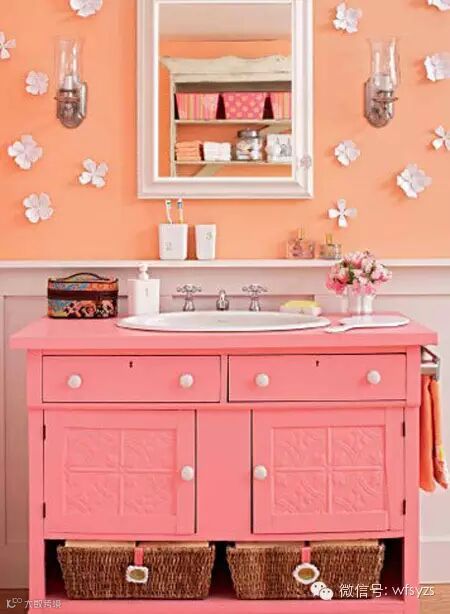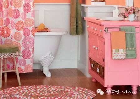 右边灰色的擦手毛巾平淡无奇,但在其下摆处绣上藕荷色的圆点,一下子就俏皮多了吧。同样,左边这条藕荷色毛巾的底边接上一块有同色系图案的花布,然后用丝带盖住接缝处,平庸的擦手巾马上变身浴室装饰物。