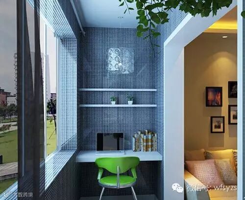 把阳台打造成书房,不仅节省空间,还有利于书房的采光。只要运用简单的台面和一些玻璃的效果将阳台封闭起来,就能形成一个独立的小书房。如图这款阳台改造的有声有色,利用窗与室内的间距贴着墙壁安放一张书桌,隔板做书架,再放一张椅子,贴近阳台的设计充满满足学习阅读所需的光线。阳台墙壁采用光滑的马赛克图案材质,墙壁上还增加了收纳,可放小盆栽,也可作书架用一举两得。经典的现代简约风格,绿色的椅子给小小的阳台注入了清新和活力。另一端则堆放绿植,给空间摄入更多氧气。