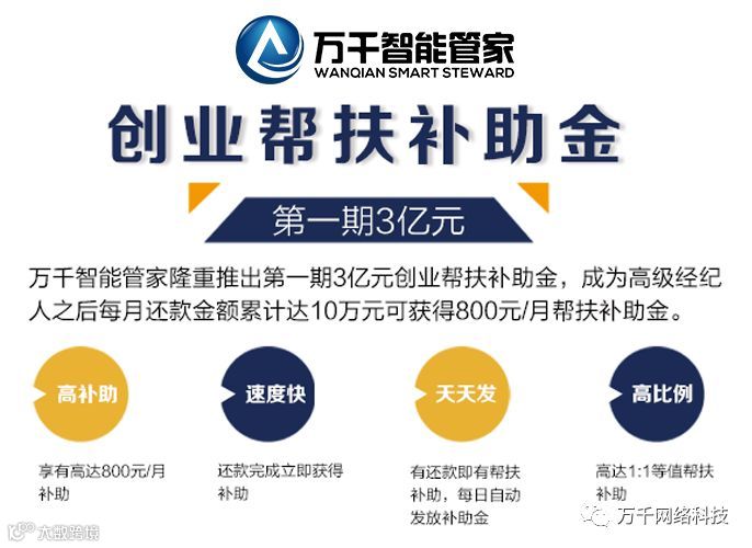现在万千智能管家更是推出了创业帮扶补助的重磅活动,高达3亿元的补助,让你还款从此无忧。