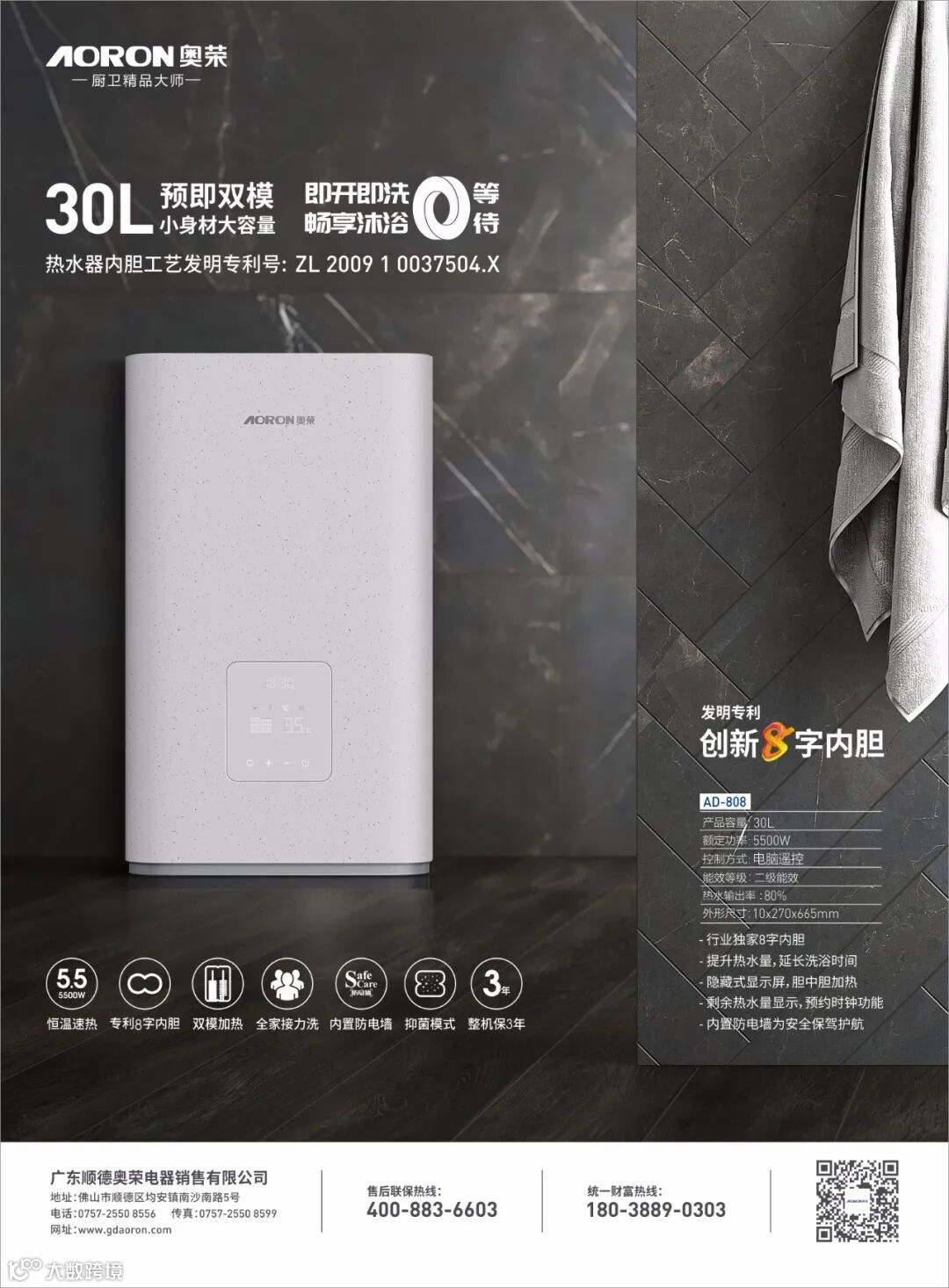 奥荣AD30-808预即双模电热水器,自带防电墙,防干烧等多重安全防护,遇到问题立即自动停止工作,贴心守护你和家人的安全。