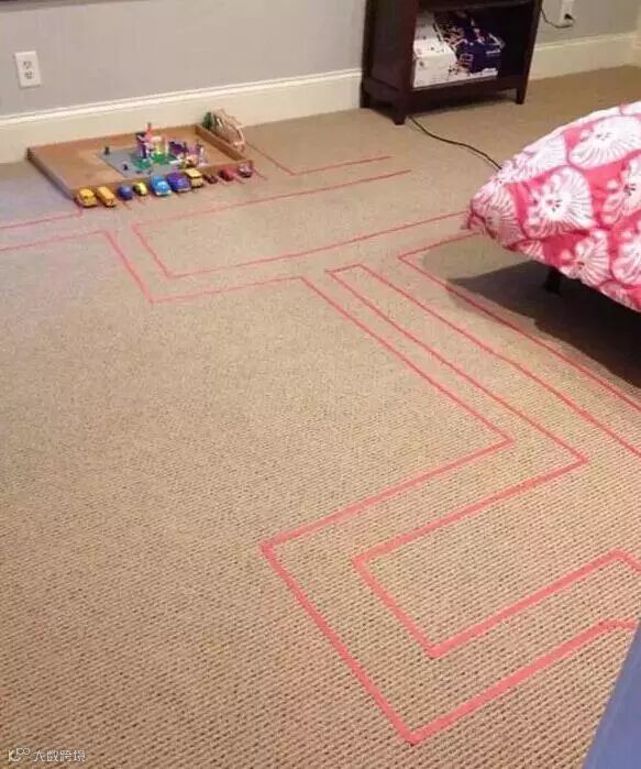 1.在地毯用彩色胶带画出道路,让孩子们在上面玩玩具车;