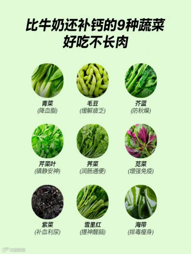 绿叶蔬菜,特别是深绿色的蔬菜中,有些含有丰富的钙,同时还富含钾、镁、维生素 C等营养素,可以促进钙的吸收和利用。所以那些不爱吃蔬菜的人,可要改变这种饮食习惯哦,要慢慢习惯吃蔬菜。具体可以尝试:菠菜、小白菜、油菜、菜薹、芥蓝、芥菜、茼蒿、韭菜、西兰花、莴笋叶、油麦菜等等。