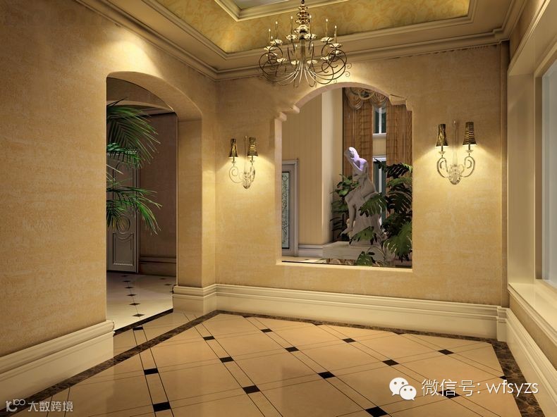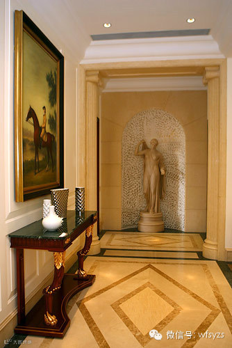 别墅玄关如果是走廊形式的,为了不影响进出两边居室,玄关家具最好不要太大,尽量使用圆润曲线造型的家具,这既会给空间带来流畅感,也不会因为尖角和硬边框给主人的出入造成不便。玄关家具一两件足矣,毕竟这里不是主要的收纳区域。除了储物的实用性, 还可以将尽头的墙面加以处理:一幅写意的装饰画,一款雅致清新的墙面造型,都可以塑造曲径通幽的美妙意境。