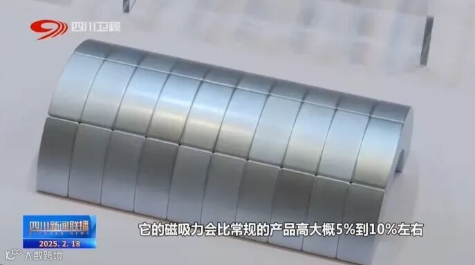 绵阳巨星永磁材料有限公司生产技术部主任 郑大伟:这款产品的磁性能,目前来讲是国内公开报道的一个最高性能,它的磁吸力会比常规的产品高大概5%到10%左右,同时它的使用温度,从100℃提高到了150℃。