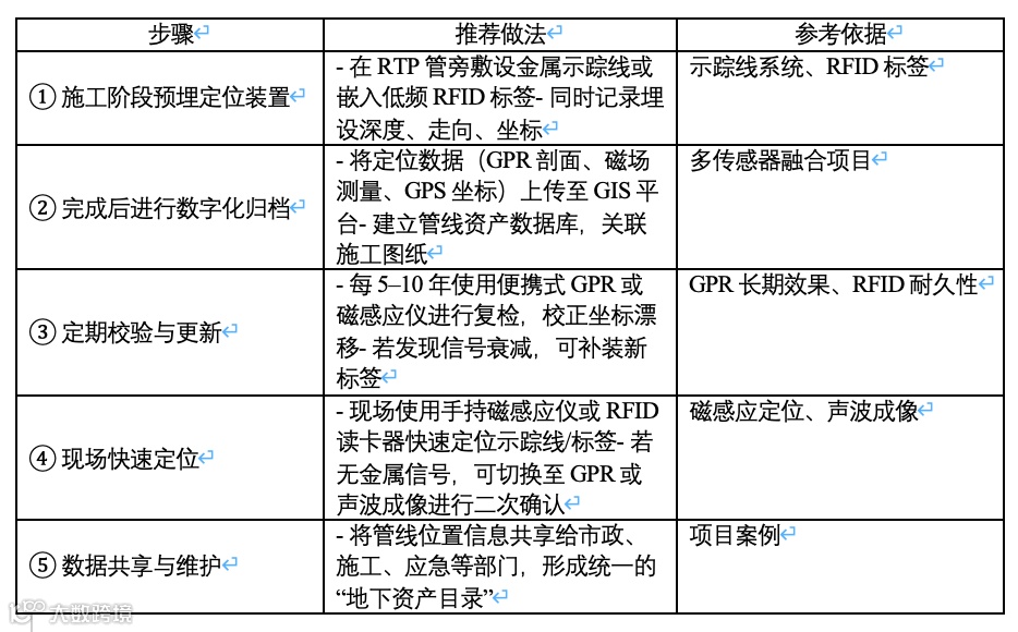 从已有的研究与实践来看,完全可以实现对埋设多年、尤其是非金属复合管(如RTP复合管)的位置进行可靠定位,只要在施工阶段配合适的“可追溯”技术并做好后期信息管理。下面从技术原理、实际案例和长期可追溯措施三方面进行说明。