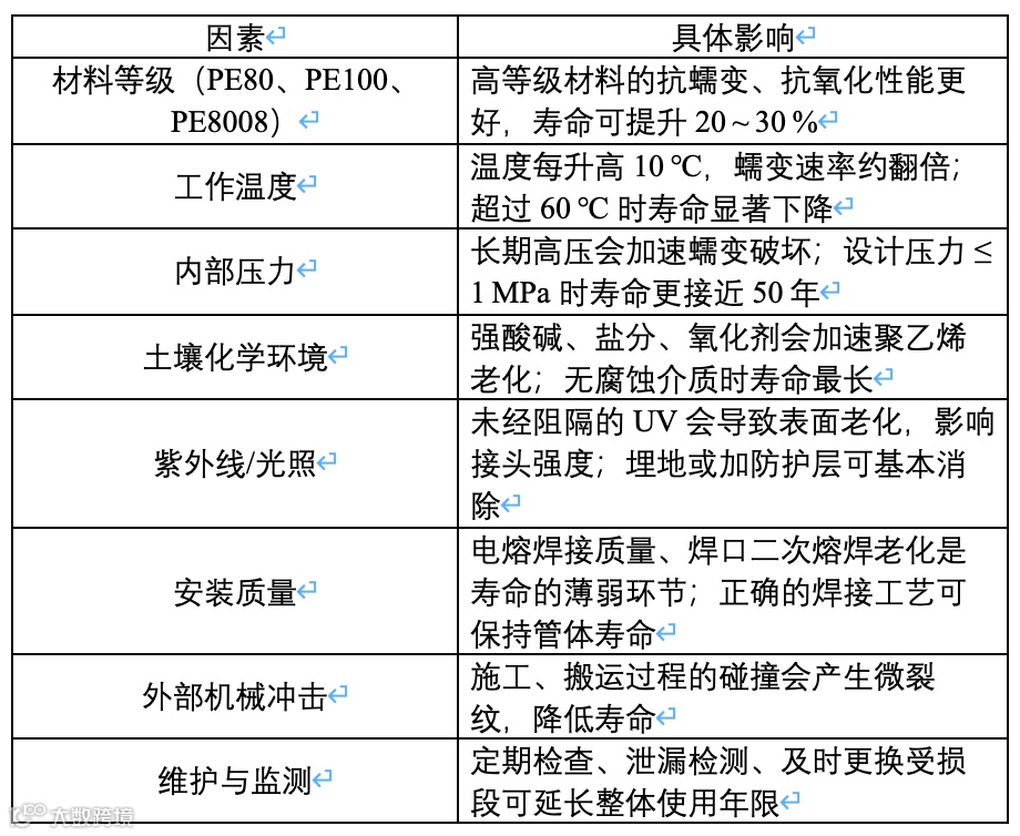 结论:在满足规范的材料、加工和安装条件下,设计寿命普遍为 50 年,部分高等级 PE100、PE8008 等材料在理论上可延伸至 100 年以上。