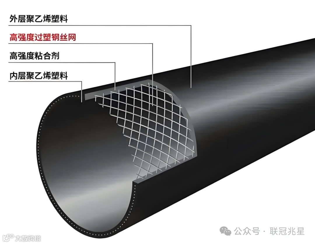 结构为高强度钢丝螺旋缠绕形成的网状骨架,内外层均包覆高密度聚乙烯(HDPE),并通过改性粘结树脂实现紧密复合。