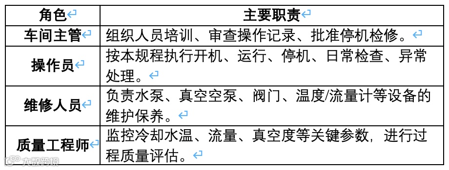 每 5 min 检查一次水温、流量、真空度,记录在《冷却运行记录表》。