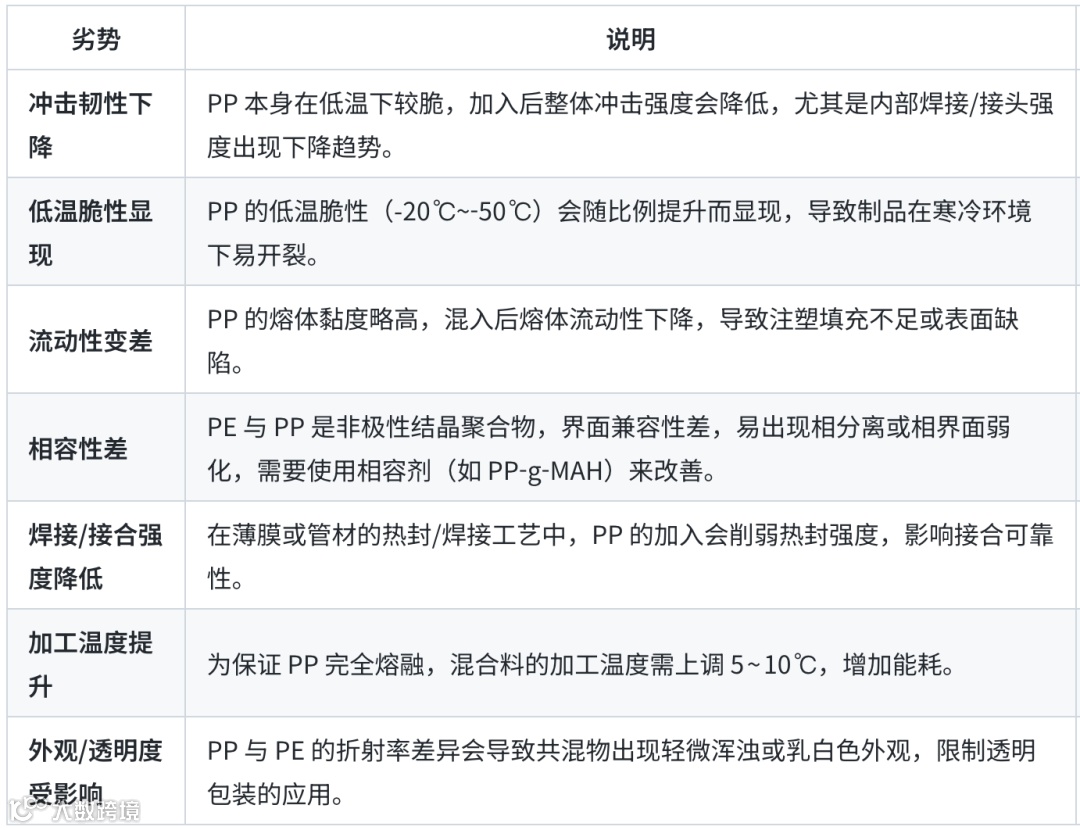 劣势:冲击韧性和低温性能下降、流动性变差、相容性问题以及可能的焊接强度降低。