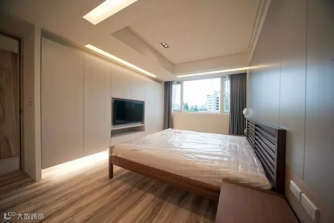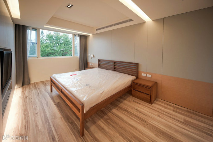 主卧房-简约的主卧房床头墙面线条内,隐藏进入更衣室的动线。