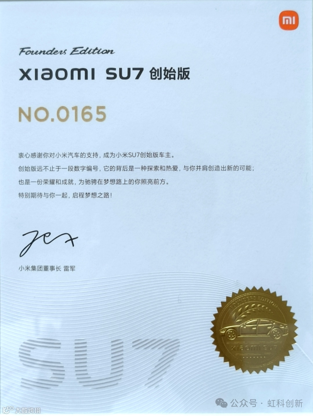 4月7日,为了支持中国新能源汽车产业,支持小米雷军人生“最后一次创业”,虹科创新公司第一时间购买了小米SU7创始版。作为虹科创新公司购买的首款智能电动公务汽车——小米 SU7集智能、时尚、动感、舒适、科技感与一身,其优雅设计完全经得起时间考验。在高技术制造业、科技创新方面,小米业已成为中国新能源汽车发展的又一面旗帜。
