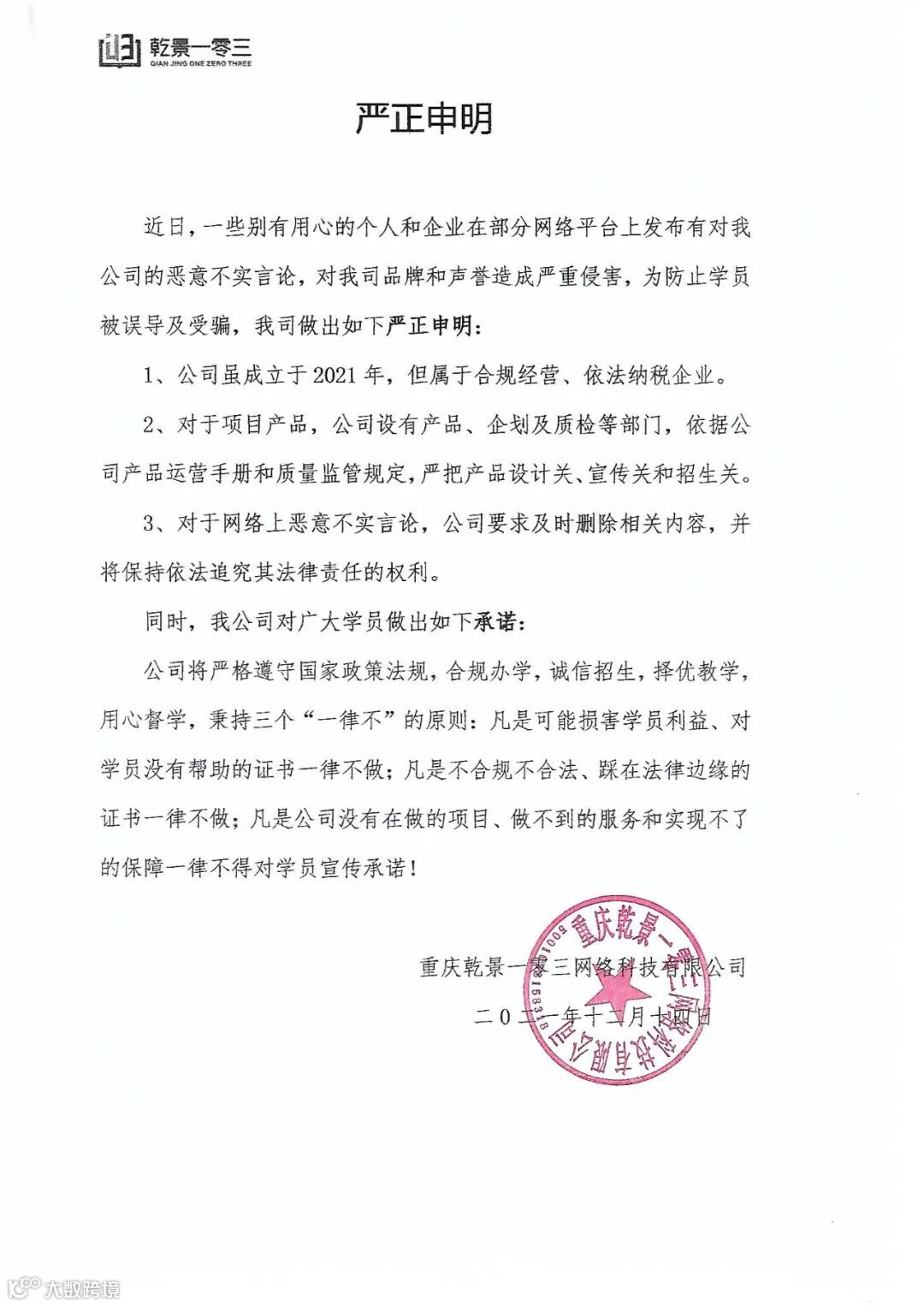 智者善学,慧者善择,选择一家有口碑,有保障的机构学习是可以让人身心愉悦的,同时也是可以摒弃后顾之忧的。重庆乾景一零三网络科技有限公司上下一心,坚决抵制虚假宣传、夸大承诺: