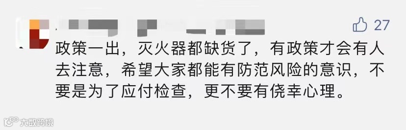 检查各种消防硬件设施是必要的,但最重要的是提升全民消防意识。消防安全事关人民群众生命财产安全,消防事业和消防行业是不会凉的,但也需要各方的配合与支持。