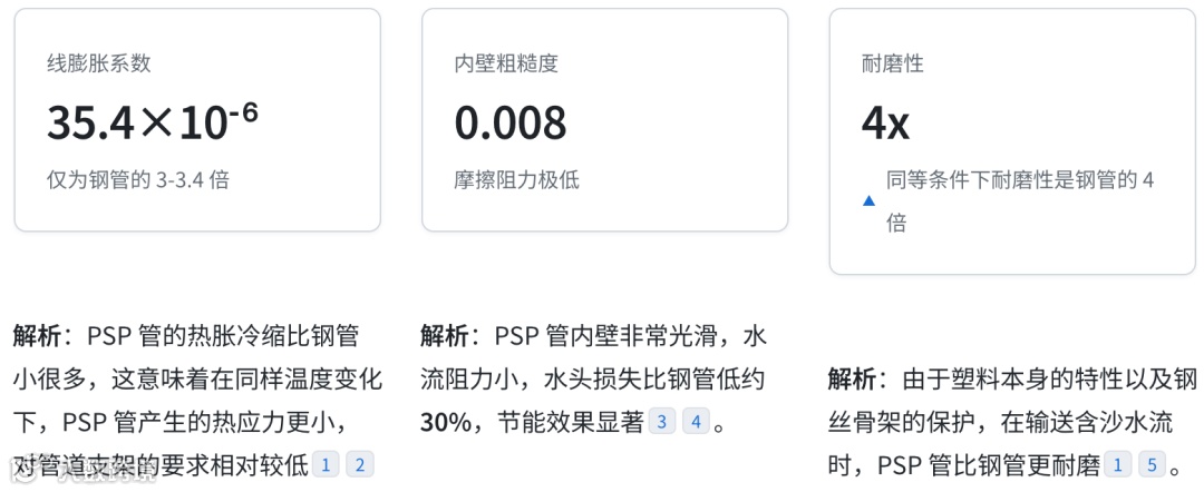 防腐问题:钢管需要严格的防腐涂层和阴极保护,且存在锈蚀风险;而 PSP 管基体为 HDPE,化学性质稳定,无需防腐处理,卫生性能好。
