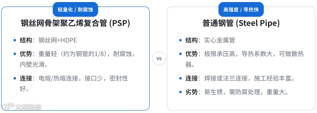 钢丝网骨架聚乙烯复合管(简称 PSP 管)是近年来在市政给水、燃气输送中广泛应用的一种新型管材。它结合了金属的高强度和塑料的耐腐蚀性。以下为您详细对比这两种材料的核心差异: