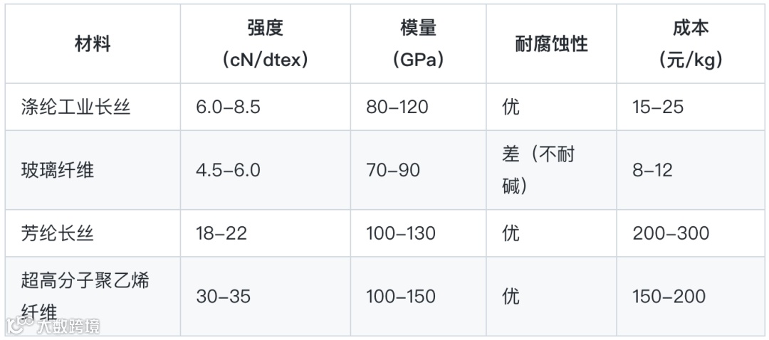结论:涤纶工业长丝在强度-成本平衡性上优势显著,适合大规模工业化应用。
