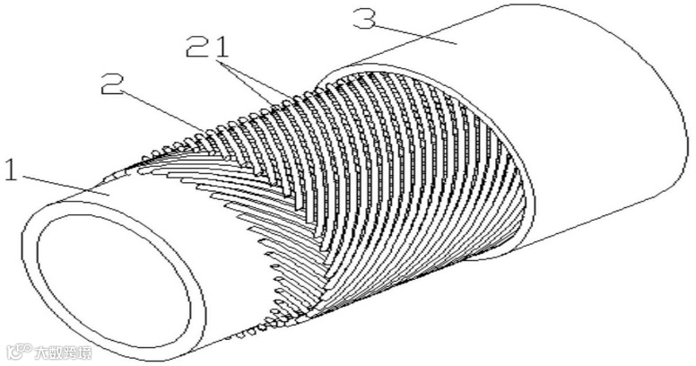 2-21增强层:为聚合物内衬层上编织或缠绕涤纶工业长丝、芳纶长丝、超高分子聚乙烯长丝或钢丝等;其作用为抵抗内压,平和环向与轴向载荷。