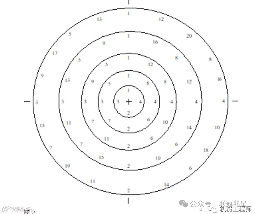 1、对法兰按对称紧固,进行紧固顺序编号,参考图 1 ,图 2 编号。