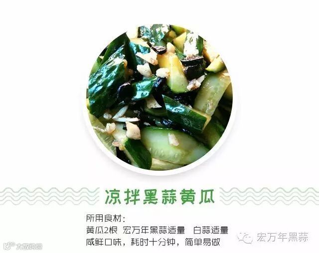菜谱特色:黄瓜味甘,甜、性凉、苦、营养素丰富,黑蒜中的微量元素含量较高、富含18种氨基酸、味道软糯酸甜。这道凉拌黄瓜既简单又营养,炎炎夏日为您送去一份清凉、一份健康。