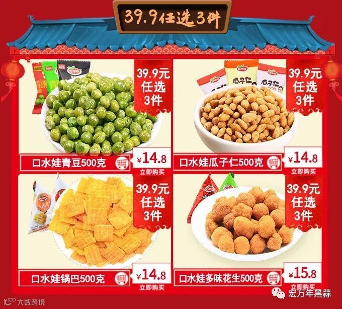 另外,喜爱零食的小伙伴们也是有福了,39.9元立选3件,过年怎么能少的了咔咔擦擦?!