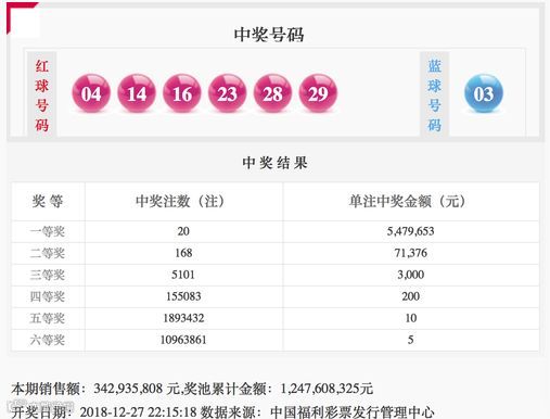 12月27日晚,中国福利彩票双色球游戏进行第2018152期开奖。当期双色球红球号码为04、14、16、23、28、29,蓝球号码为03。