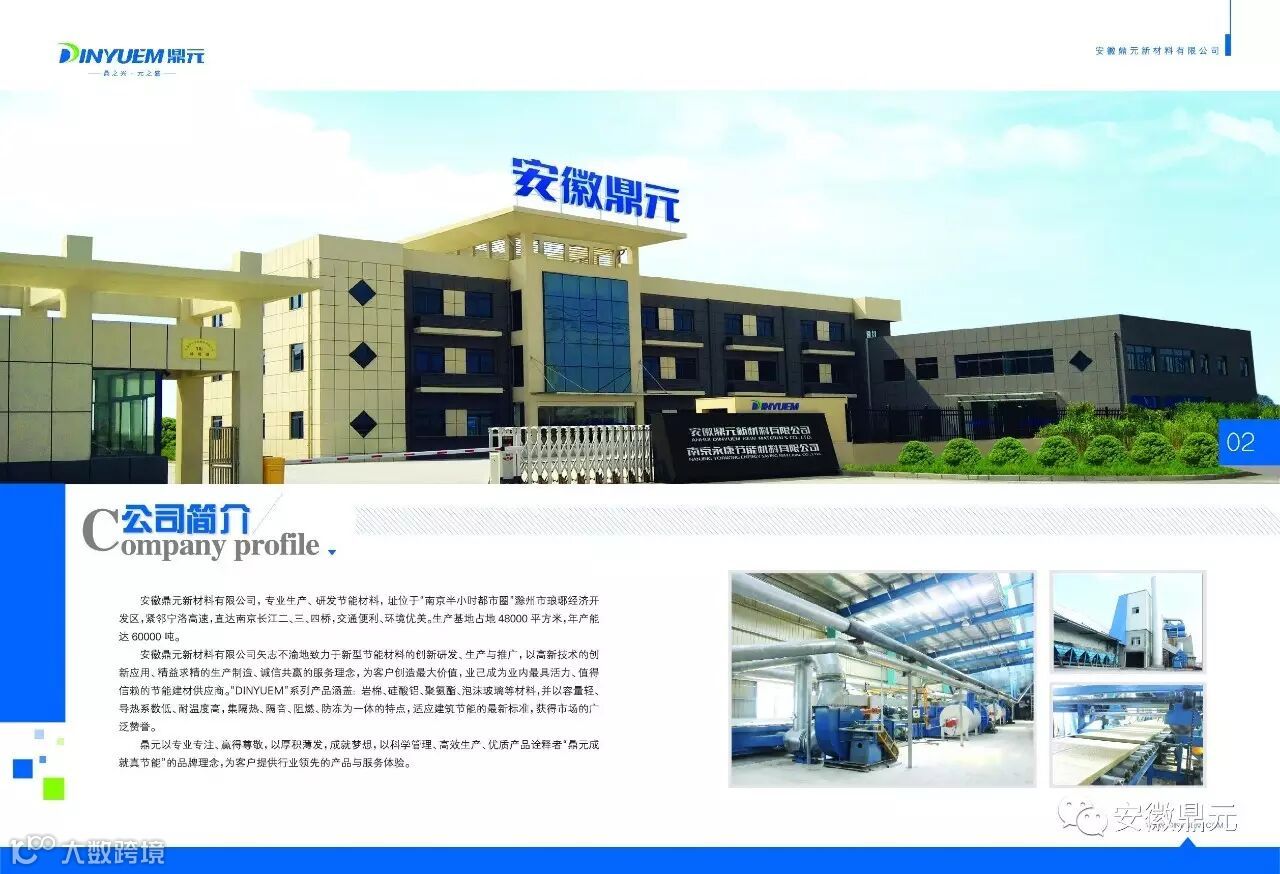 安徽鼎元新材料有限公司矢志不渝地致力于新型节能材料的创新研发、生产与推广,以高新技术的创新应用、精益求精的生产制造、诚信共赢的服务理念,为客户创造最大价值,业已成为业内最具活力、值得信赖的节能建材供应商。“DINYUEM”品牌系列产品覆盖岩棉、硅酸铝、聚氨酯、泡沫玻璃等材料制品、并以容重轻、导热系数低、耐温度高,集隔热、隔音、阻燃、防冻为一体的特点,广泛适用于石油化工、冶金电力、建筑交通等行业的绝热、节能、保温、隔音工程。