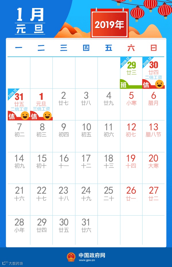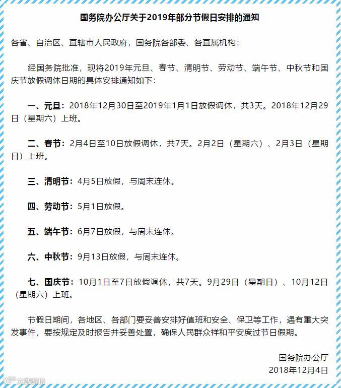 2019年节假日安排公布啦!