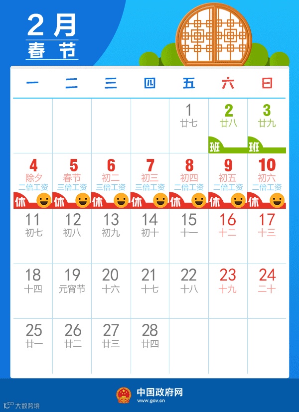 调休建议:2月2日、3日请年假,你可以连着春节假期连休9天;或者2月11—15日连着请5天年假,那么你就可以连休12天;当然你如果年假不止5天,你就可以请2月2、3日和2月11—15日,再加上一个周末,你就可以连休16天啦~(这个请根据实际情况操作