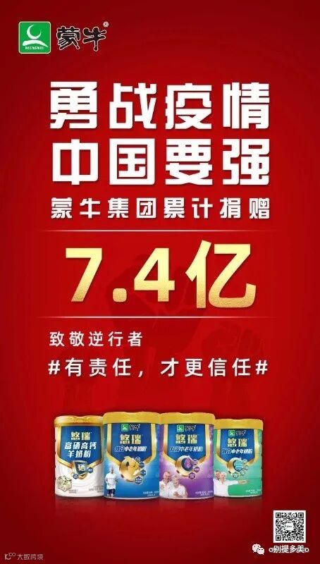 各位家人大力关注蒙牛。蒙牛集团,全国首家开展捐赠乳企,位列乳品及整个快消品行业第一名。自1月22日首次开展捐赠以来,蒙牛连续通过中华慈善总会、内蒙古自治区红十字会捐赠7.4亿元款物,精准切入、迅速落地、实时公示,为打赢这场抗疫战争贡献自身的所有能量。新冠肺炎疫情发生后,蒙牛人第一时间用营养捐赠和助力白衣天使,和一线医护人员站在一起。1月22日、23日,蒙牛集团率先为武汉市第一医院、武汉大学中南医院送去了价值20万元的牛奶产品,向危难时刻的“逆行者”致敬并提供营养支持,成为了全国第一家开展抗疫捐赠的乳企。