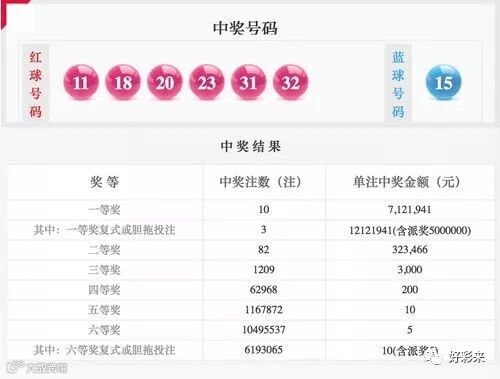11月27日晚,中国福利彩票双色球游戏进行第2018139期开奖,这是2018年双色球10亿元大派奖活动启动的第十七期派奖。当期双色球红球号码为11、18、20、23、31、32,蓝球号码为15。