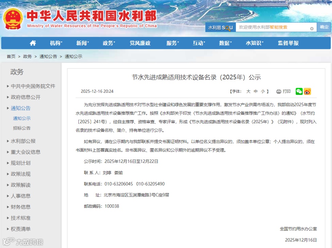2025年12月16日,中华人民共和国水利部正式公示《节水先进成熟适用技术设备名录(2025年)》,河南瀚源水务有限公司自主研发的"智慧用水管理平台"凭借卓越的技术创新能力和显著的节水实效,成功入选通用节水技术设备类别。这是瀚源水务首次荣获国家级技术认定,标志着公司在智慧水务与节水科技领域迈上新台阶。