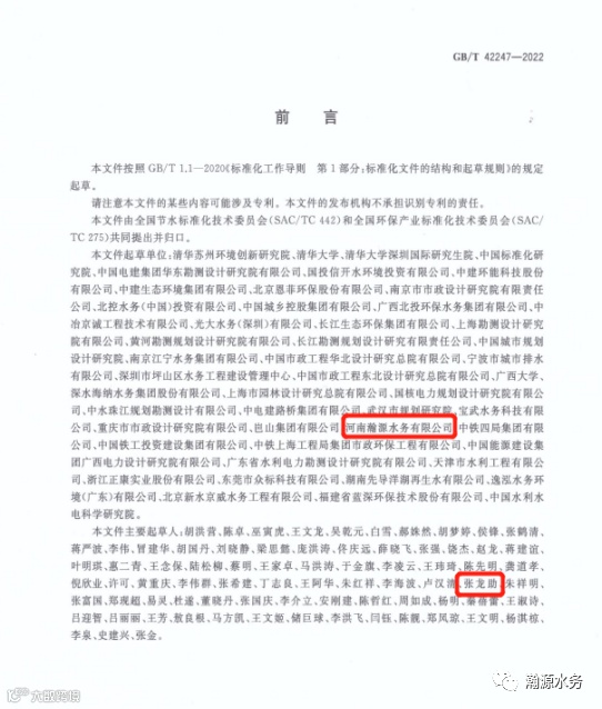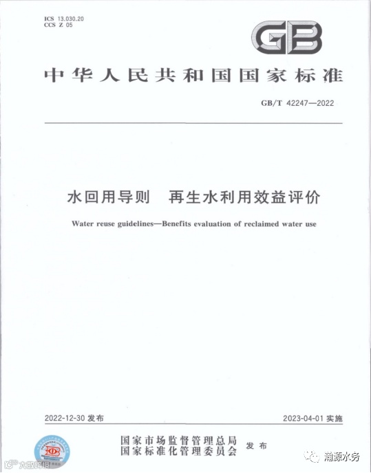 2022年12月30日,由清华大学、中国标准化研究院等单位牵头制定的《水回用导则 再生水利用效益评价》(GB/T42247-2022)系列国家标准,经国家市场监督管理总局、国家标准化管理委员会批准正式发布。河南瀚源水务有限公司与黄河勘测设计研究院有限公司、长江勘测设计研究有限公司等单位一起参与制定。