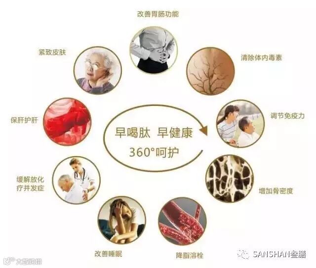 人体不可或缺的内源性物质,及时补充营养,快速恢复体能。时刻保持健康态"早喝肽,早健康,随着年龄增长,人体自身的胶原蛋白合成力就会减弱,至35左右,皮肤中胶原蛋白含量还会出现一个从峰值开始下降的转折点。这就像钙质的流失一样,是“大势所趋”。所以,想要更长久地保持健康年轻态,就要每天坚持,及时补充。"