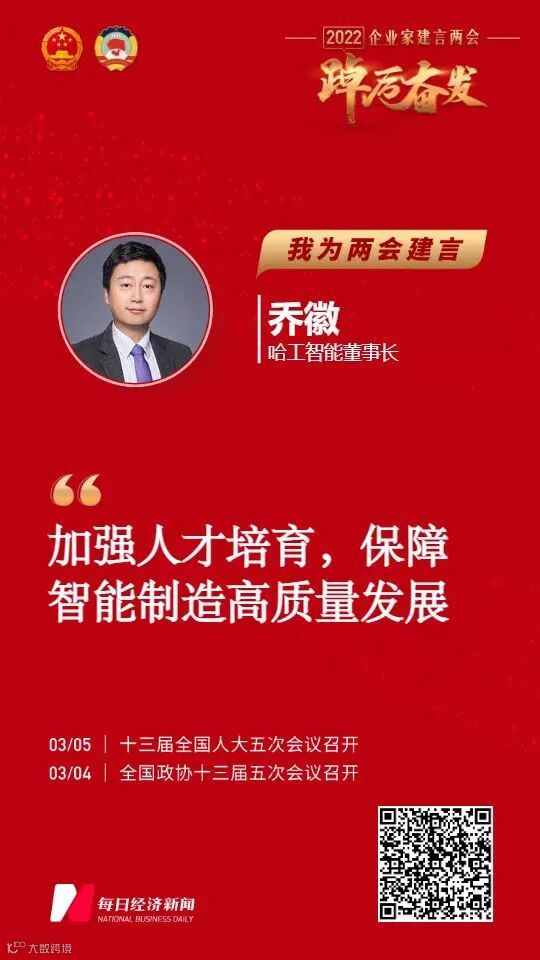 中国经济的发展,离不开企业家的决心与投入。国内主流财经媒体《每日经济新闻》推出2022年两会专题,邀请上百位中国企业家发表真知灼见,建言两会。哈工智能董事长乔徽应邀并提议:加强人才培育,保障智能制造高质量发展。