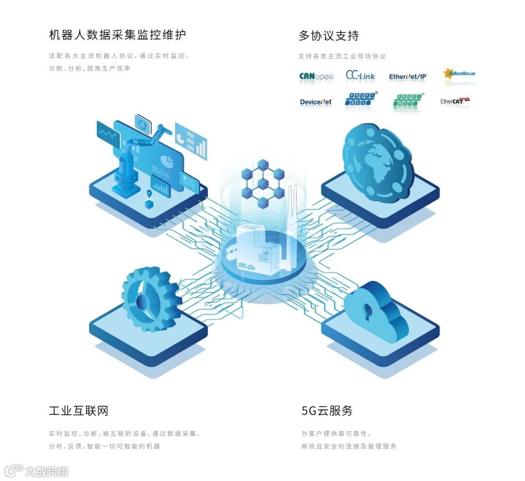 51CLOUD以数据采集为基础,可与国内外主流机器人及生产设备数据交互。比如,51CLOUD自主研发的All-IN-ONE采集板卡,网关集网络通信、协议转换、规则引擎、数据存储等功能于一体,与平台共同实现工业物料网的云管端一体化解决方案,可直接与主流工业机器人、PLC、工业控制器及PC连接,实现组网在线监控。于本次工博会最新亮相的旗舰版ALL-IN-ONE板卡全面支持5G,具有模块设计、自有组合、边缘计算和数据清洗、远程监控和下载、配置极简可快速安装、安全可靠等特性,支持更多工业协议,可连接更多不同型号的机器人。