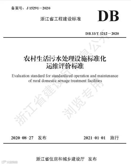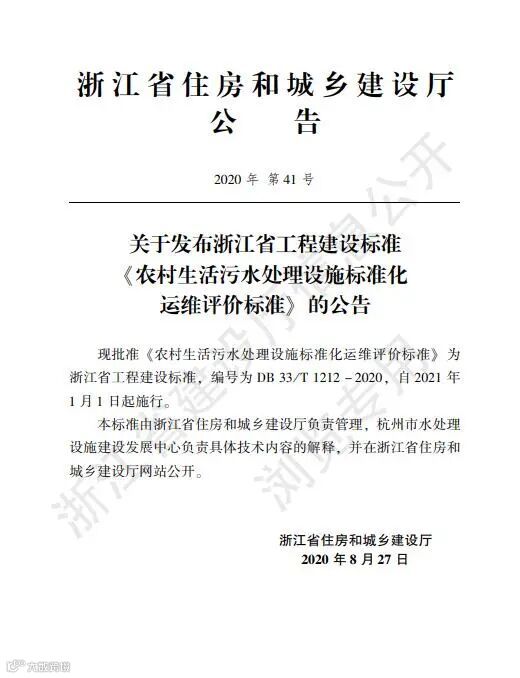 近日,浙江省工程建设标准《农村生活污水处理设施标准化运维评价标准》发布,编号为DB33/T1212-2020, 自2021年1月1日起施行。