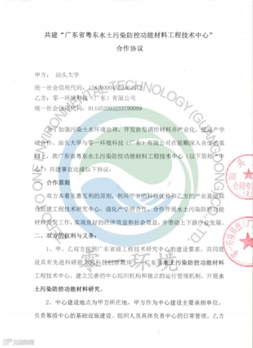 近日,零一环境科技(广东)有限公司与汕头大学签订了共建”广东省粤东水土污染防控功能材料工程技术中心“合作协议。