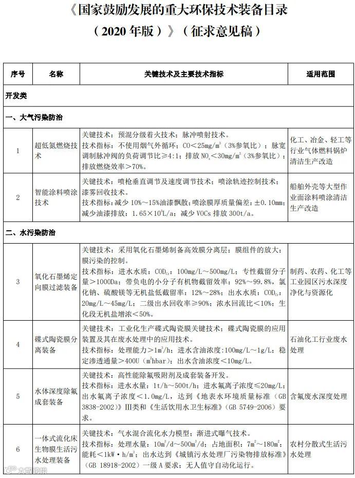 快讯|《国家鼓励发展的重大环保技术装备目录(2020年版)》(征求意见稿)