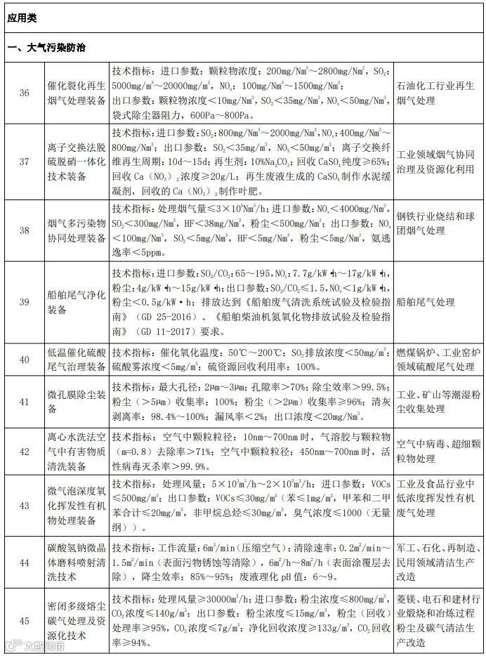 。目录分为开发类、应用类以及推广类,涵盖大气污染防治、水污染防治、土壤污染修复、固体废物处理、环境监测专用仪器仪表、环境污染应急处理、环境污染防治设备专用零部件等领域。